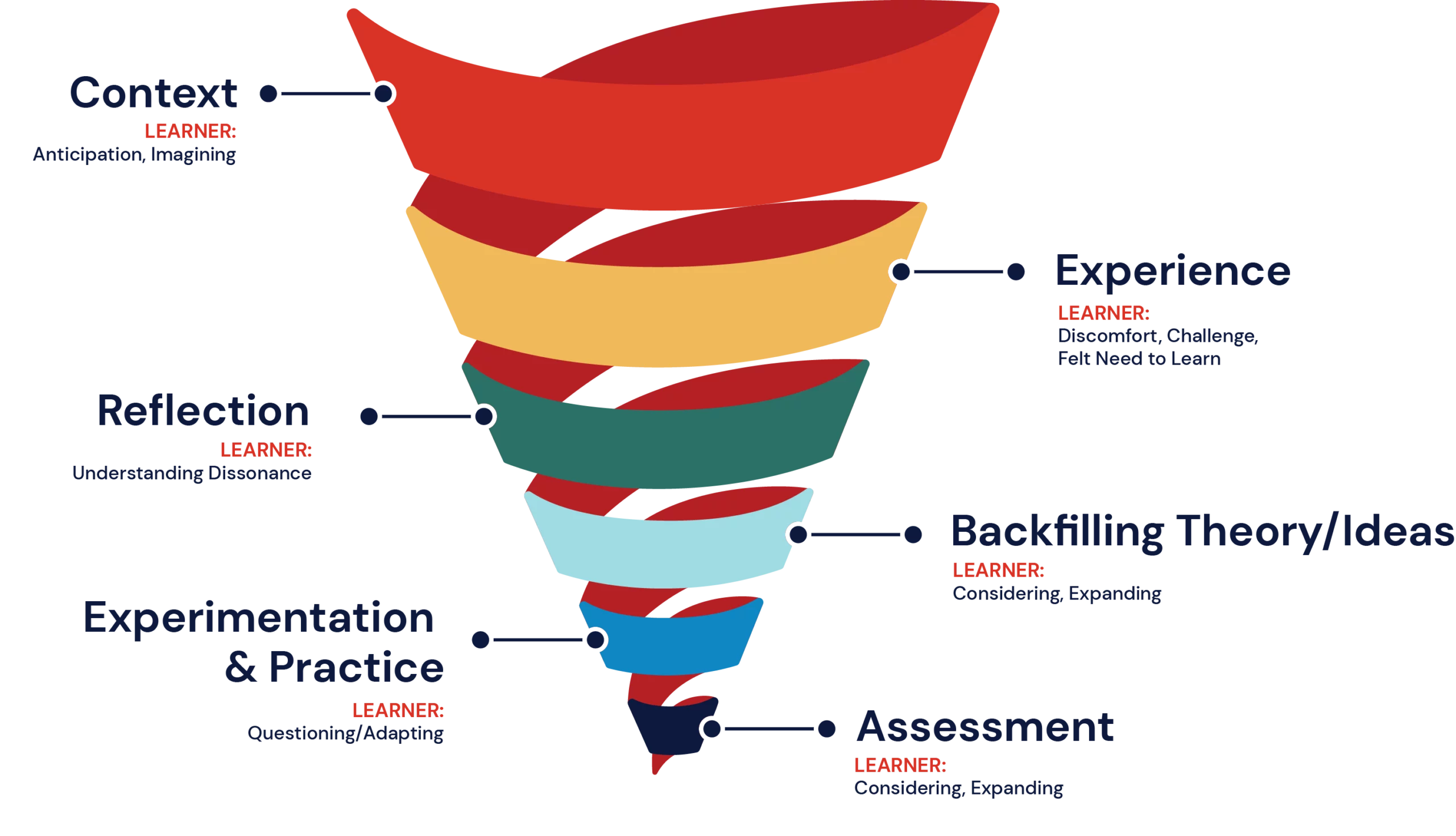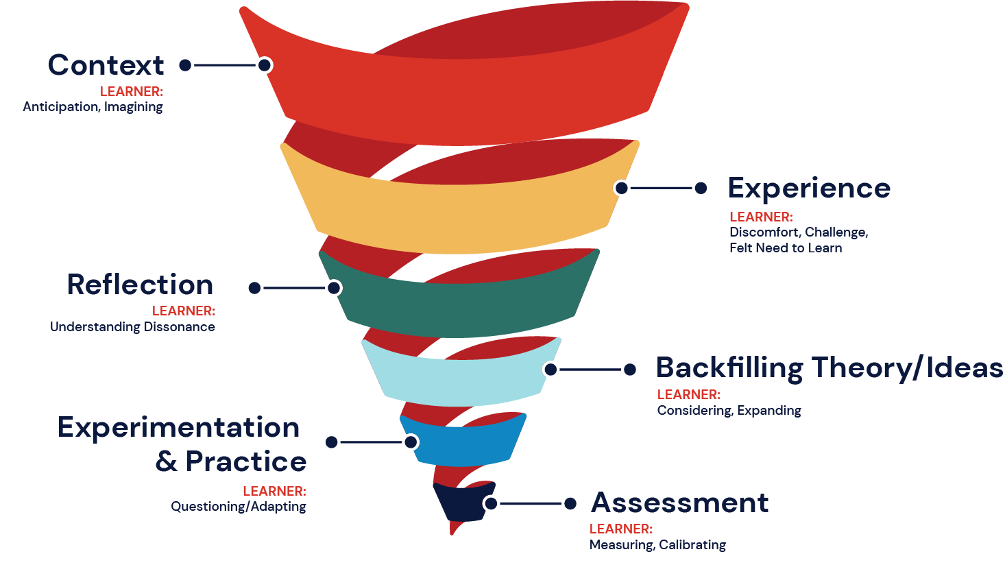 When the desired outcome is a change in mindset or behavior, learning must engage both reflection and active experimentation. These experiences require depth, emotional engagement, and sustained reinforcement. David Kolb’s Experiential Learning Model (1984) offers a useful framework for designing transformational learning through experience, reflection, conceptualization, and application.